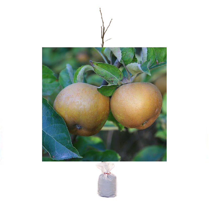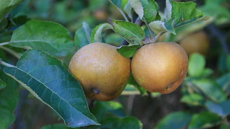 Frutos: La manzana tiene un color verde pardo con presencia de russeting ("cicatrices") en toda la superficie de la fruta. Su forma es muy irregular y su carne es de textura gruesa, no muy jugosa y de color blanco.