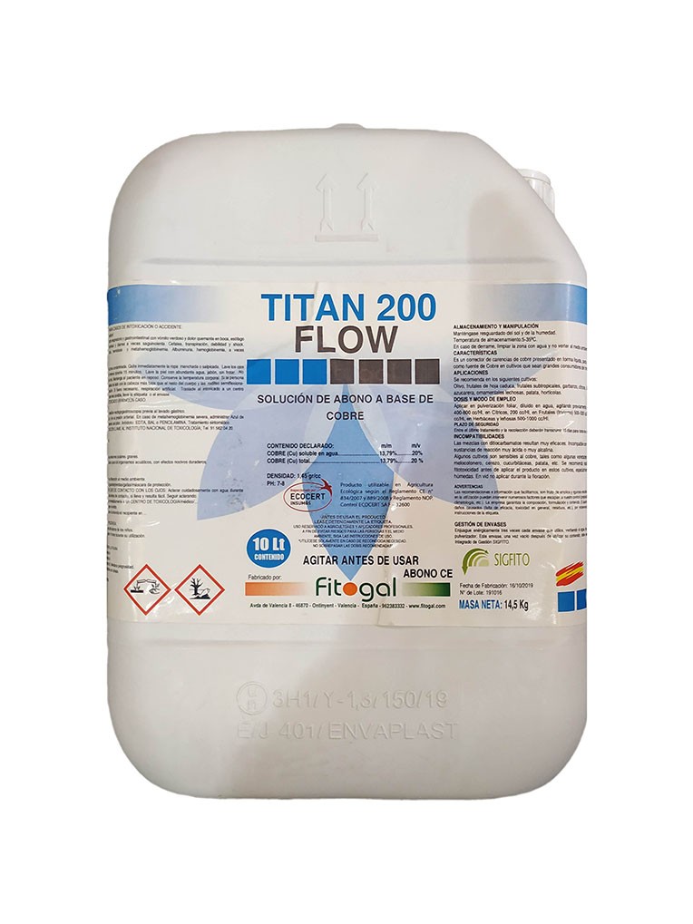 Titan 200 Flow es un corrector de carencias de cobre presentado en forma líquida, para utilizarlo por vía foliar como fuente de Cobre en cultivos que sean grandes consumidores del mismo.