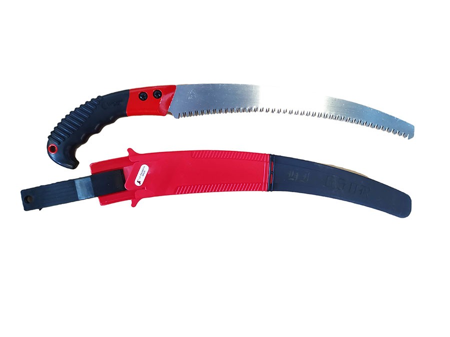Serrucho de hoja curva de 330 mm. Tiene mango de plástico revestido en goma, que hace el trabajo muy cómodo para la mano, incluso sin utilización de guantes. El diseño especial del mango con su forma en curva reduce el esfuerzo necesario para el corte, facilitando el corte de madera dura. La funda de plástico de protección facilita el transporte de la sierra.